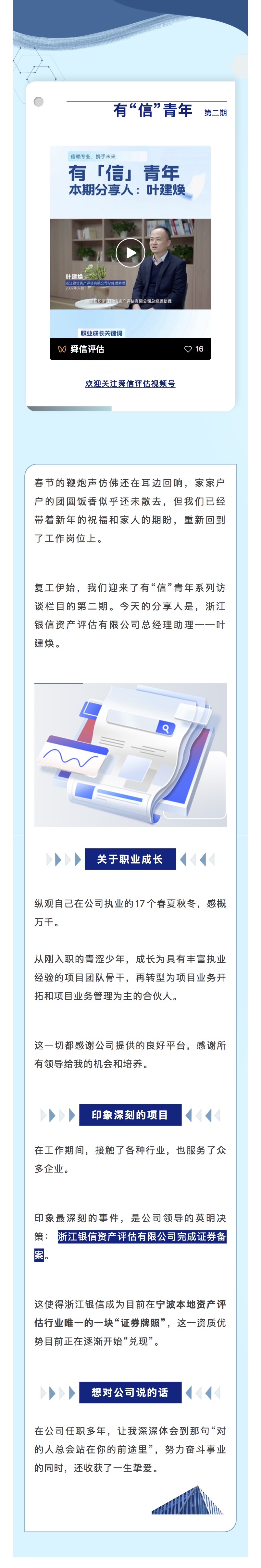 下一篇:下一篇:有“信”青年丨喜欢自由和挑战,行业特质调动激情——访谈浙江银信评估助理任艳玲